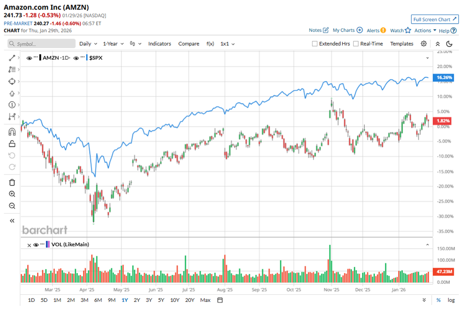 Amazon revealed last October that it expects capital expenditures to reach about $125 billion in 2026, the highest forecast among mega-cap companies at the time. Yet, despite that bold vision, the stock hasn’t exactly matched the company’s sky-high ambitions. With a market capitalization of roughly $2.6 trillion, Amazon shares are up just about 2% over the past year, lagging behind the broader S&P 500 Index’s ($SPX) 14.29% gain in 2025 as investors weigh the risks of massive AI spending and rising competition in the space.
