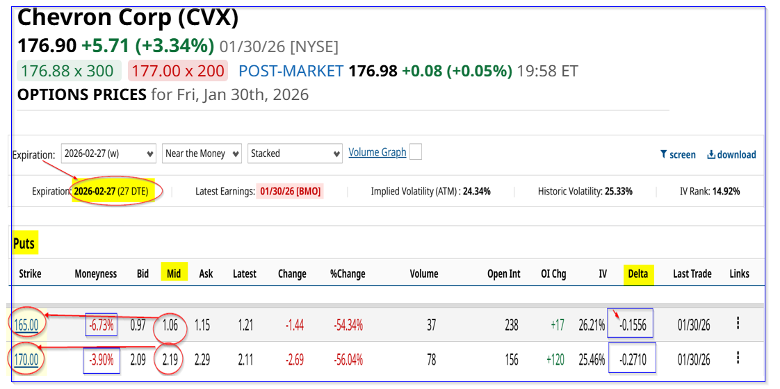 The $170.00 put, i.e., with a 3.90% distance away) has a $2.19 midpoint premium, providing a 1.288% yield (i.e., $2.19/$170.00). In addition, the $165 put strike price (6.73% OTM) has a $1.06 midpoint premium.