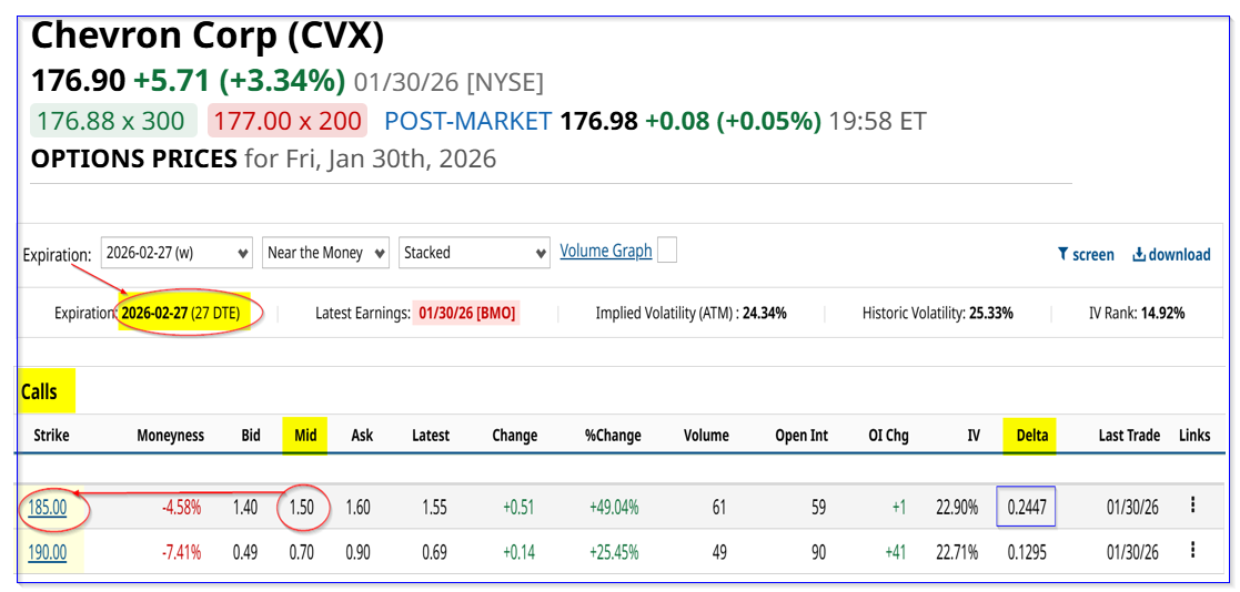 For example, look at the Feb. 27, 2026, expiry period. The $185.00 call option strike price has a midpoint premium of $1.50. That provides a covered call seller a 27-day yield of 0.85% (i.e., $1.50/$176.90).