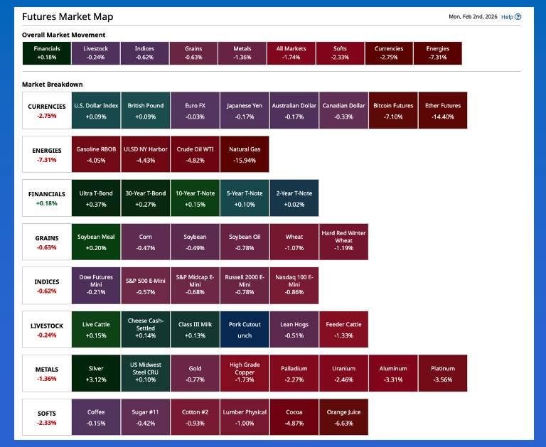 Morning Summary: There is a red glow coming from the commodity complex as February, the Dog Days of Winter (Summer in South America) gets under way. A look at the Barchart Futures Market Heat Map pre-dawn Monday and we see all sectors but Financials (US Treasury futures) in the red. Why are Treasury futures in the green? Most likely on follow-through buying from last Friday when the self-proclaimed President of Venezuela announced his choice for puppet to chair the US Federal Open Market Committee. A look at the Fed fund futures (ZQG26) forward curve to start the new month, though the next FOMC meeting isn’t until March, and we see the market continues to price in a June rate cut of 25-basis points. This should come as no surprise as the June meeting should be the first chaired by Kevin Warsh, aka Charlie Horse (of Sherry Lewis puppetry fame). On the other end of the Heat Map spectrum we find the Energies sector showing an average loss of 7.3%. Here we see all four major markets under heavy pressure, led by the always fun natural gas (NGH26) market (aka the Widow Maker) showing a loss of 15.9%. As for metals, Silver rebounded a bit from last Friday’s meltdown while gold remains under pressure.