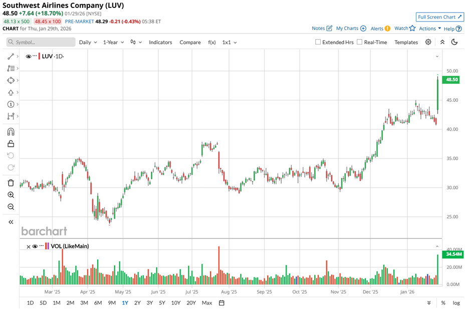 Southwest Airlines (LUV) has delivered one of its strongest market moments in decades. On Thursday, Jan. 29, its stock surged 18.7% to close at $48.50, a four-year high, following the release of the company’s fiscal 2025 Q4 results. The move marked its biggest single-day percentage gain since 1978 and its strongest close since Nov. 2021.