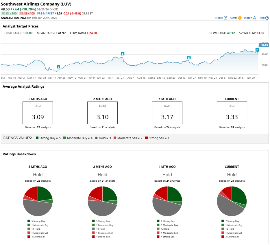 As a result, LUV stock carries a consensus rating of “Hold,” with opinions spread across the spectrum. Of the 24 analysts covering the stock, seven rate it “Strong Buy,” one suggests “Moderate Buy,” 12 call for “Hold,” one recommends “Moderate Sell,” and three remain firmly in the “Strong Sell” camp.