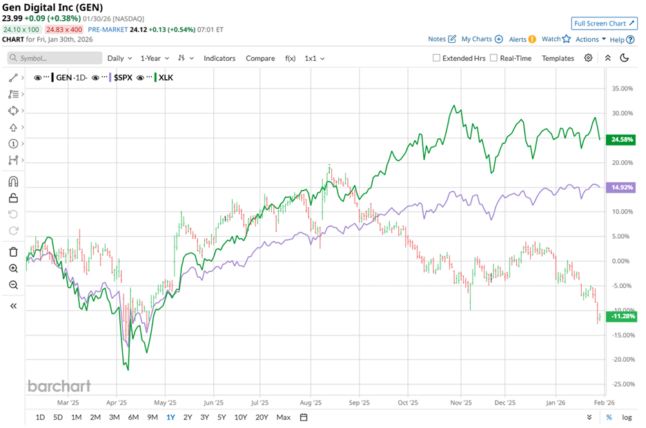 Over the past 52 weeks, Gen Digital’s shares declined nearly 14%, clearly lagging the S&P 500 Index ($SPX), which advanced 14.3% over the same span. The underperformance has extended into 2026, with the stock down 11.8% year-to-date (YTD), while the benchmark index posted a modest 1.4% gain.