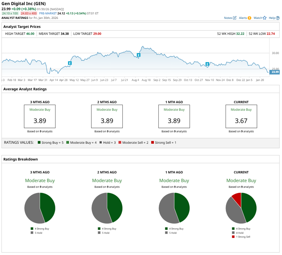 Gen Digital drew mixed reactions from Wall Street in January. On Jan. 16, RBC Capital’s Matthew Hedberg maintained a “Hold” rating with a $29 target. Earlier, UBS reiterated a Buy rating on Jan. 13 and lifted expectations with a $36 price target.