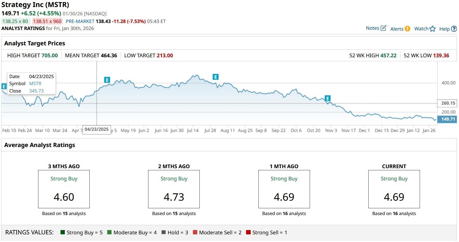 According to Barchart, the consensus rating on MSTR shares currently sits at “Strong Buy,” with the mean target of about $464 indicating potential upside of more than 200% from here.