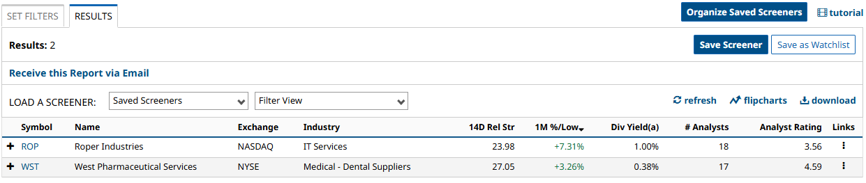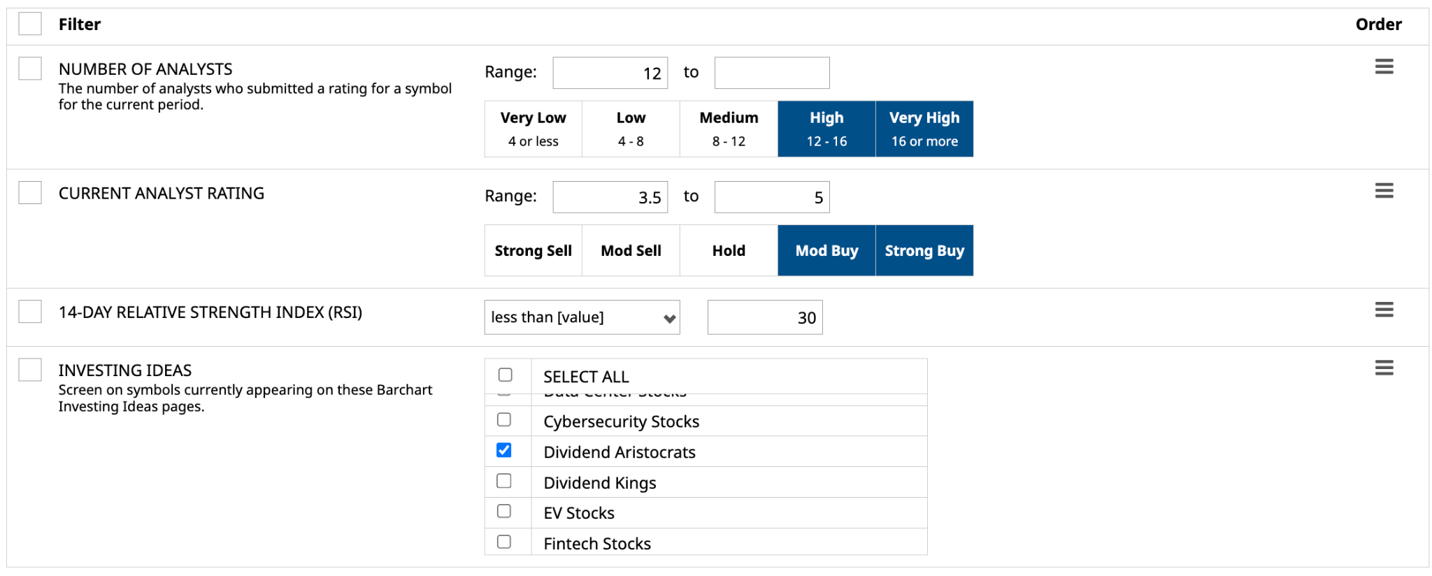 Using Barchart’s Stock Screener, I selected the following filters to get my list: