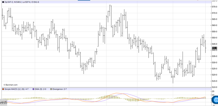 See on the daily bar chart for May soft red winter wheat futures that prices are trending higher. See, too, at the bottom of the chart that the moving average convergence divergence (MACD) indicator is in a bullish posture as the blue MACD line is above the red trigger line and both lines are trending up.