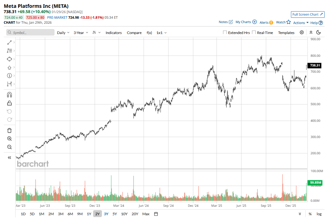 Microsoft and Meta Platforms are two stories in contrast, though. While the former saw a double-digit dip on Jan. 29, Meta Platforms soared by a similar quantum and rose above $700. Notably, META stock previously fell below $700 following the company's third-quarter 2025 earnings release in October and traded below that level until Q4 earnings turned the tide.