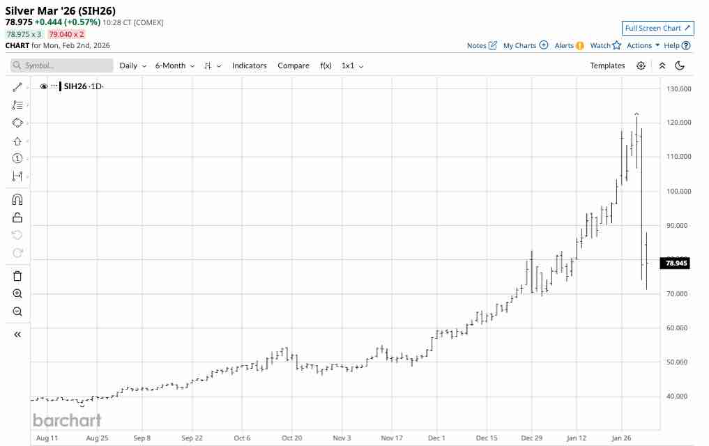 The daily March COMEX silver futures chart shows that the price rose to a record high of $121.785 per ounce on January 29 before falling below $85 and settling at $78.531 on January 30. While silver was 11.23% higher in January, gravity hit the precious metal along with its siblings, gold, platinum, and palladium.