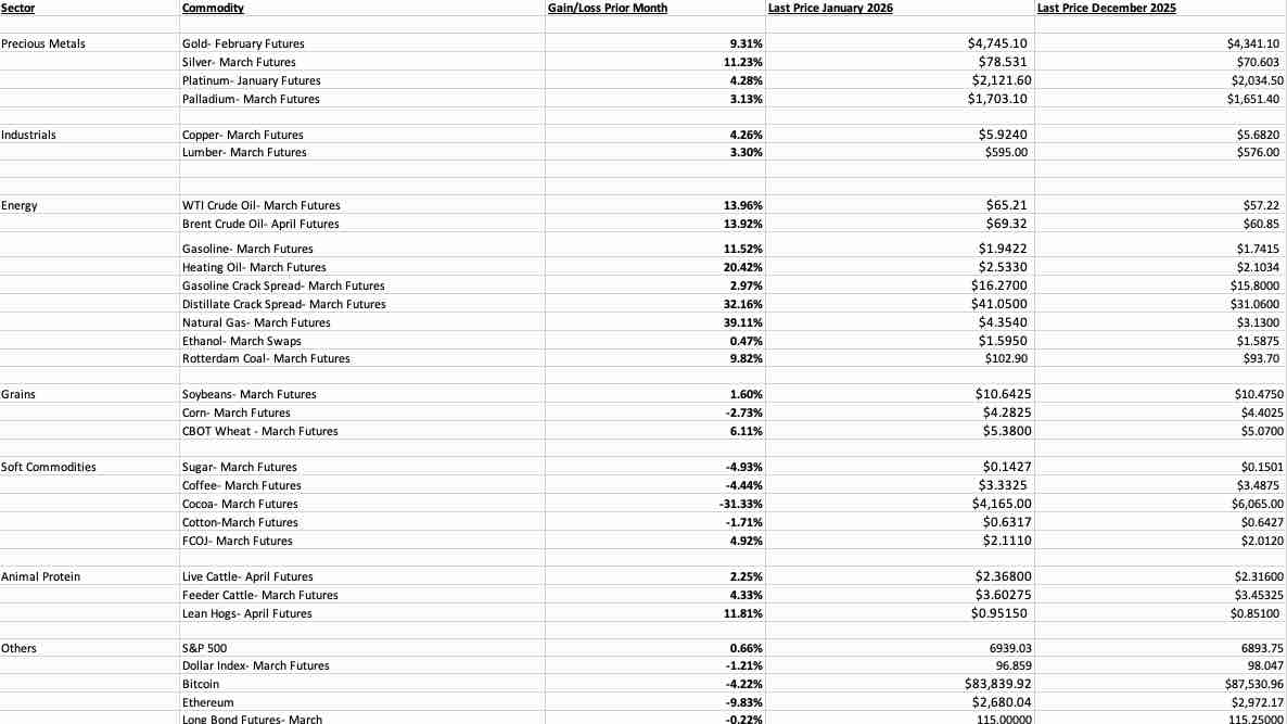 As the commodities move into February, they are in the heart of winter, seasonality continues to favor some price weakness in meats and gasoline, and strength in natural gas. Volatility is likely to remain elevated in NYMEX U.S. natural gas futures over the coming weeks. However, as spring approaches, expect volatility in these sectors with the driving season in gasoline and the 2026 grilling season on the horizon.