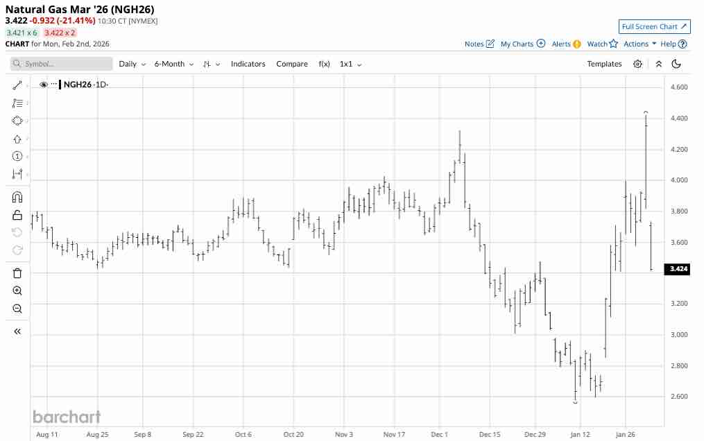 The daily chart of March NYMEX natural gas futures highlights the 39.11% gain in January.