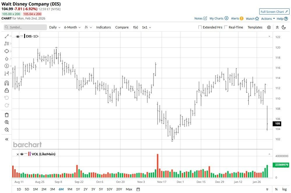 Disney (DIS) shares are inching down this morning after the entertainment giant said its per-share earnings declined by 7% on a year-over-year basis in its fiscal Q1. The selloff pushed DIS decisively below its major moving averages (50-day, 100-day, 200-day), indicating downward momentum could sustain — at least in the near-term.