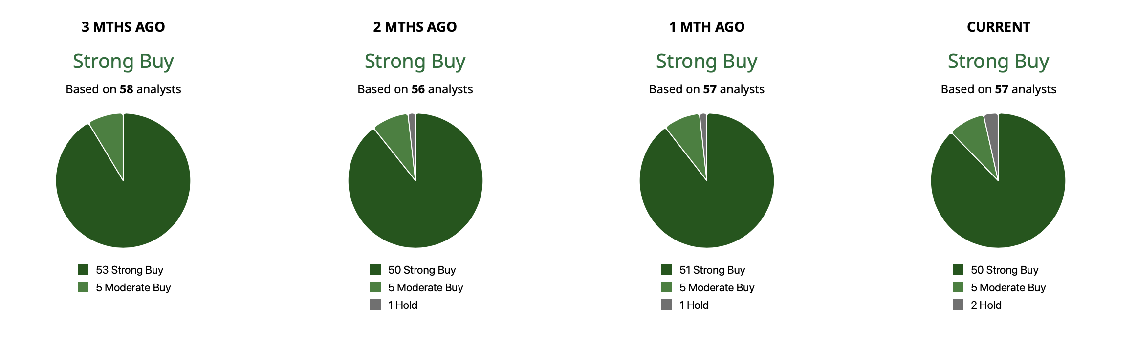 Of the 57 analysts covering AMZN stock, 50 have it rated as a “Strong Buy,” five rate it a “Moderate Buy,” and two rate it a “Hold.” Presently, the mean target price among analysts is $297.67, implying 24% upside. The high-end target is $360, implying 50% upside.