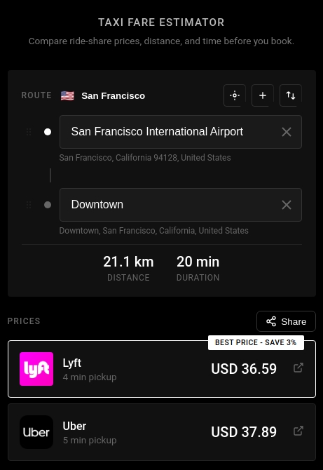 The Uber fare estimate functionality works by aggregating publicly available pricing data and route calculations, providing consumers with the same information they would see in the native apps—but consolidated into a single interface. The Lyft price estimate feature operates similarly, allowing true apples-to-apples comparison.