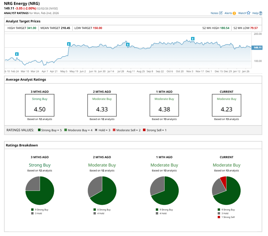 Among the 13 analysts covering NRG stock, the consensus is a “Moderate Buy.” That’s based on nine “Strong Buy” ratings, three “Moderate Buys,” and one “Strong Sell.”