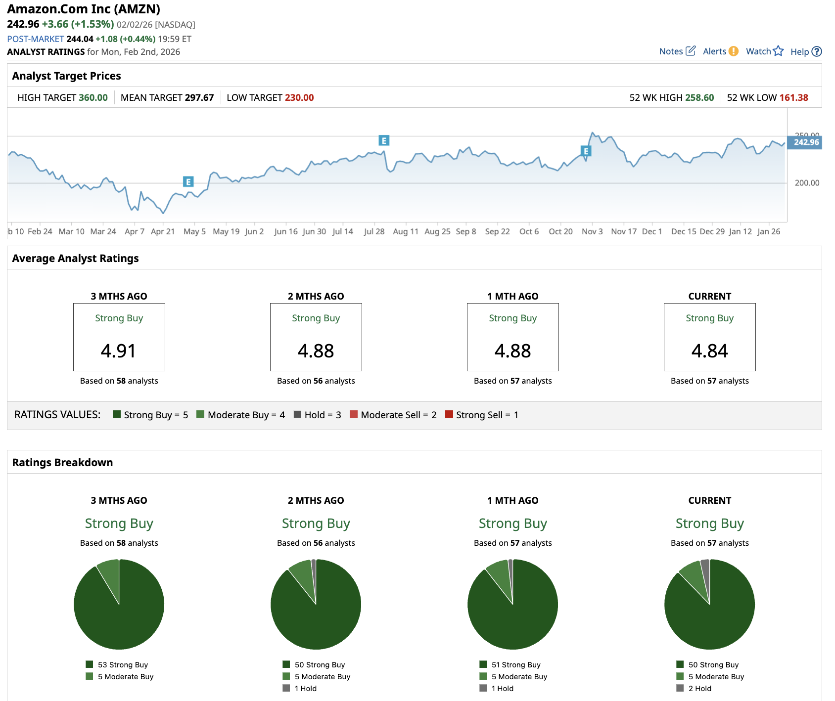 Out of the 57 analysts covering AMZN stock, 50 recommend “Strong Buy,” five recommend “Moderate Buy,” and two recommend “Hold.” The average Amazon stock price target is $297.67, above the current price of $243.