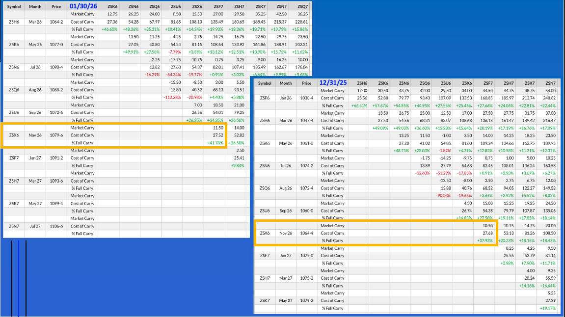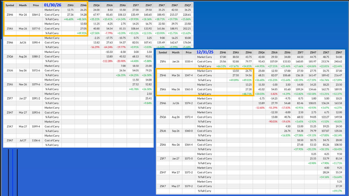 What is the market telling us? At the end of January, the March-May futures spread covered 47% calculated full commercial carry as compared to the end of December’s 49% and the 2025 edition of the spread the same week last year covering 56%. The numbers for the May-July futures spread were 52% (end of January 2026), 49% (end of December 2025), and 53% (end of January 2025). The bottom line is the commercial outlook for US soybeans through the spring of 2026 is about the same as it was last year.