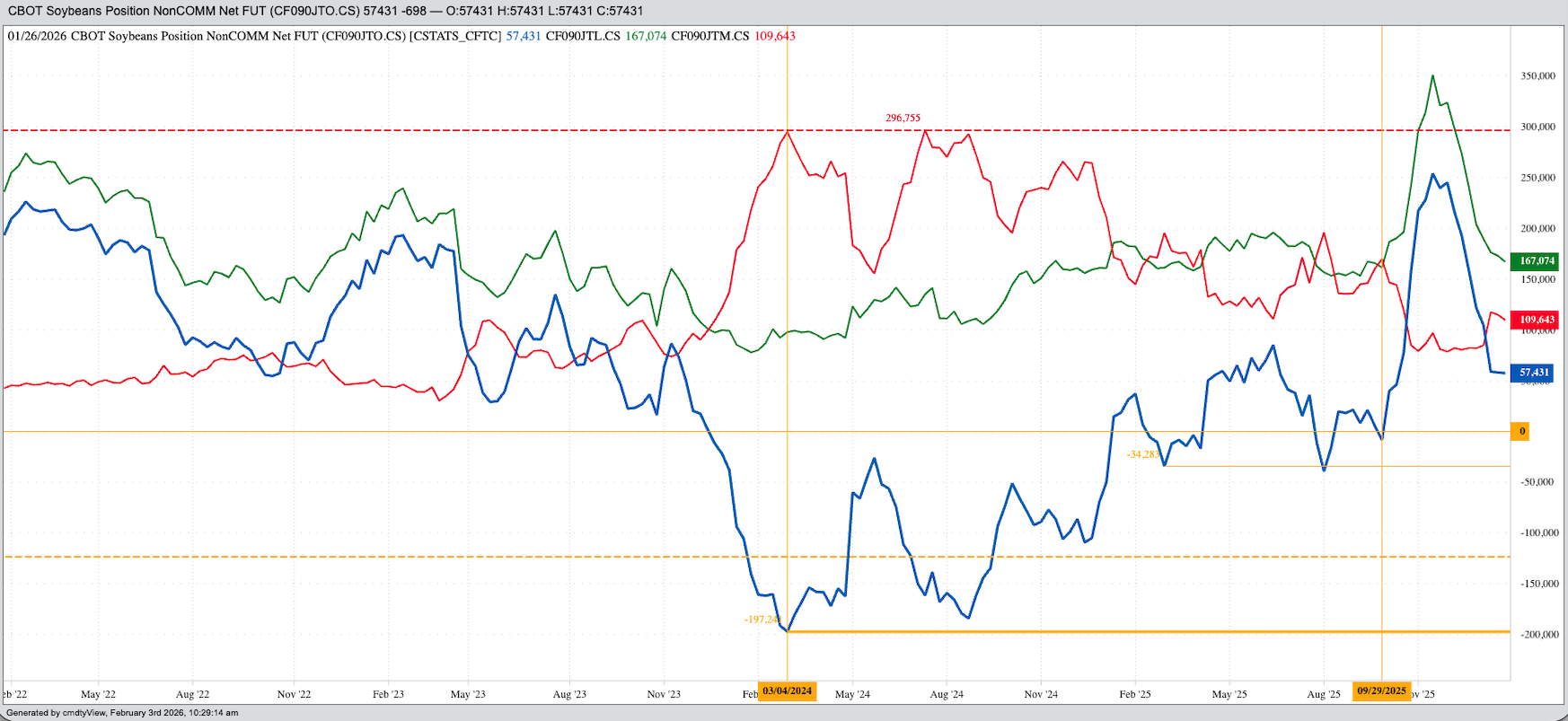 As of this writing, the picture for the US soybean market seems clear. China is waiting to see how Brazil’s harvest does during February, a month that includes China’s weeklong New Year Holiday, before committing to ship the 226 mb of US soybeans it held on the books as of January 22. If we see futures spreads, both old-crop and new-crop, start to cover more calculated full commercial carry we will have a good idea those bushels are not going to be taking a boat ride to China. Watson will see this as well, meaning some, or all, of its net-long futures position of 57,430 contracts could be liquidated. And if both sides of the market are selling, commercial and noncommercial, the end result is easy to guess.