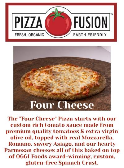 The "Four Cheese" Pizza starts with our custom rich tomato sauce made from premium quality tomatoes & extra virgin olive oil, topped with real Mozzarella, Romano, savory Asiago and our hearty Parmesan cheeses all of this baked on top of OGGI Foods award winning, custom, gluten-free Spinach Crust;