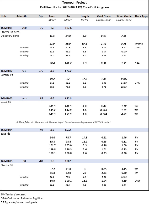 "We are very pleased with the impressive results of this program. These results confirm the high-grade areas and continuity of mineralization found in the most recent Tonopah resource model. This drilling program achieved its targeted goals of confirming the resource model, while also capturing a full spectrum of samples at varying grades and rock types for upcoming metallurgical and environmental testwork", stated Mr. James Hesketh, President & CEO.