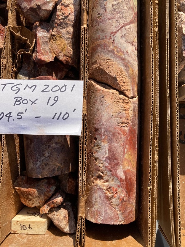 TGM2001 intercepted 59.1 meters averaging 1.31 grams per tonne ("g/t") gold and 5.56 g/t silver in a steady sequence of Tertiary Volcanics ("TV") and Ordovician Palmetto Argillite ("OPA") to depth in the original Discovery zone, which is located in the phase one Starter Pit area.
