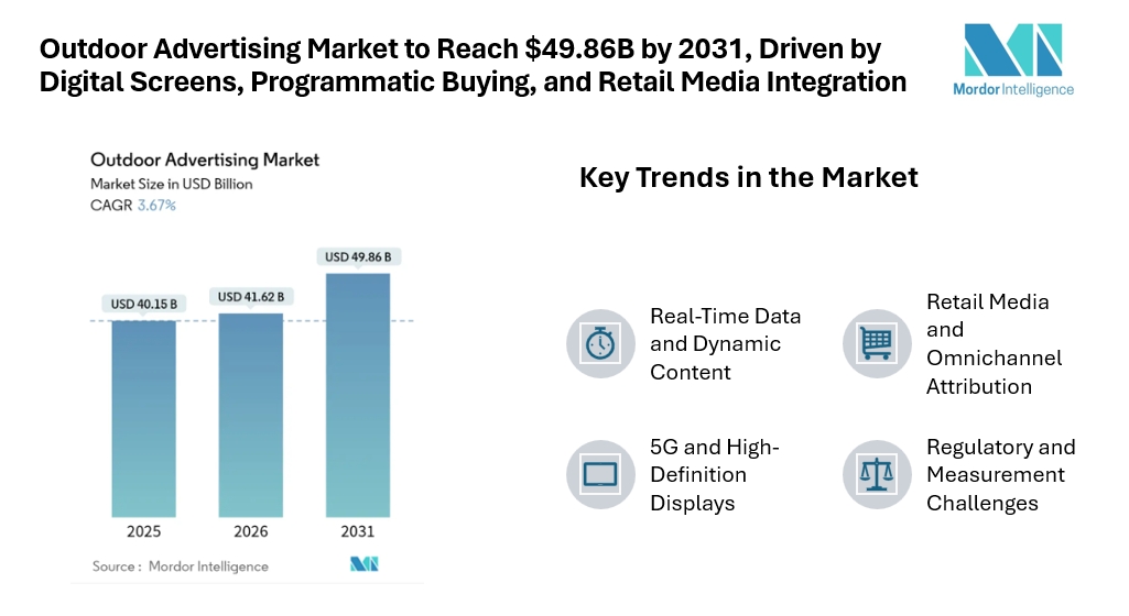 According to Mordor Intelligence, the global outdoor advertising market was valued at USD 40.15 billion in 2025 and is estimated to grow from USD 41.62 billion in 2026 to reach USD 49.86 billion by 2031, registering a CAGR of 3.67% during the forecast period (2026–2031). The steady rise in the outdoor advertising market size reflects consistent spending in established economies, expanding digital screen networks in emerging cities, and the channel’s role as a privacy-compliant complement to online media. The outdoor advertising industry continues to attract brand budgets as advertisers look for reliable reach without dependence on third-party cookies.