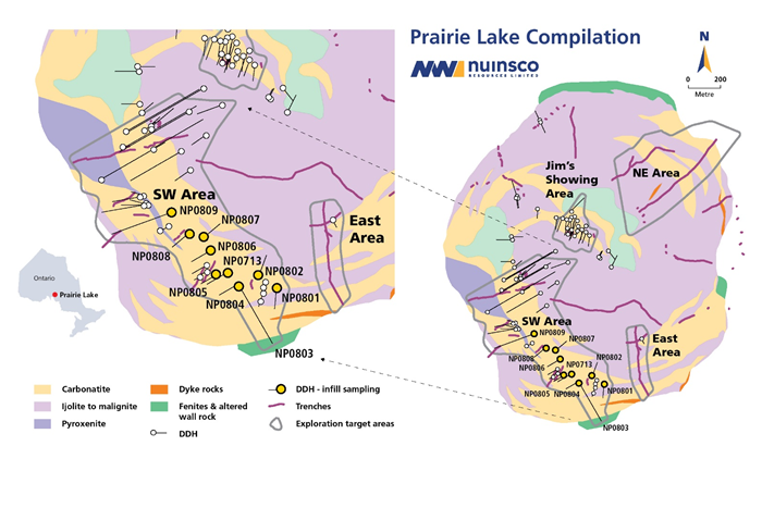 TORONTO, ON / ACCESSWIRE / July 15, 2021 / Nuinsco Resources Limited ("Nuinsco" or "the Company") (CNSX:NWI.CN), is pleased to announce results for previously unsampled drill core from diamond drilling programs conducted at its 100%‐owned Prairie Lake project near Terrace Bay, Ontario. This additional sampling of hole NP0713 more than triples the length of the known intercept of niobium (Nb), tantalum (Ta), phosphate (P2O5), and rare earth elements (REE) including lanthanum (La), cerium (Ce), samarium (Sm), neodymium (Nd) and yttrium (Y), extending it by 72m for the hole. The program continues with the sampling focussing on drill holes collared to intercept the Southwest (SW) Area to ultimately provide information to support the Company's goal of establishing a mineral resource on the property.