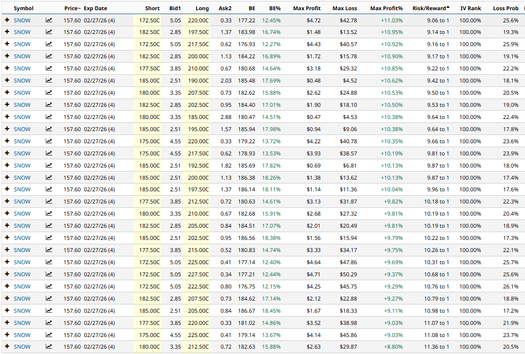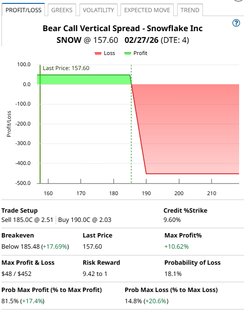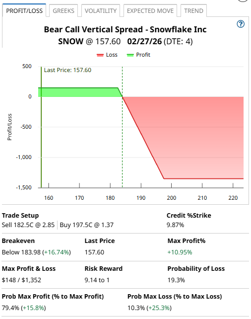 This Bear Call Spread on SNOW stock involves selling the $185-strike February 27th call and buying the $190-strike call.