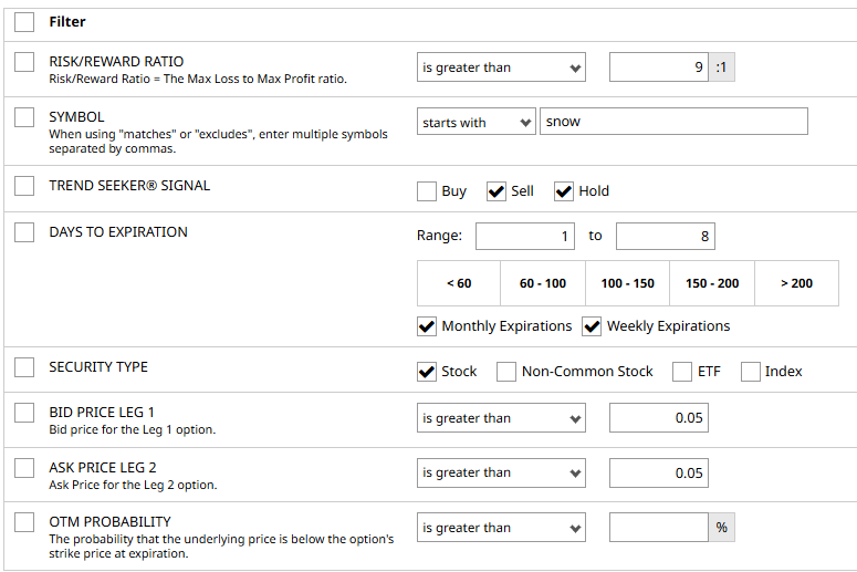 Assuming we have a bearish outlook on SNOW stock, we can run the Barchart’s Bear Call Spread Screener and find the following results: