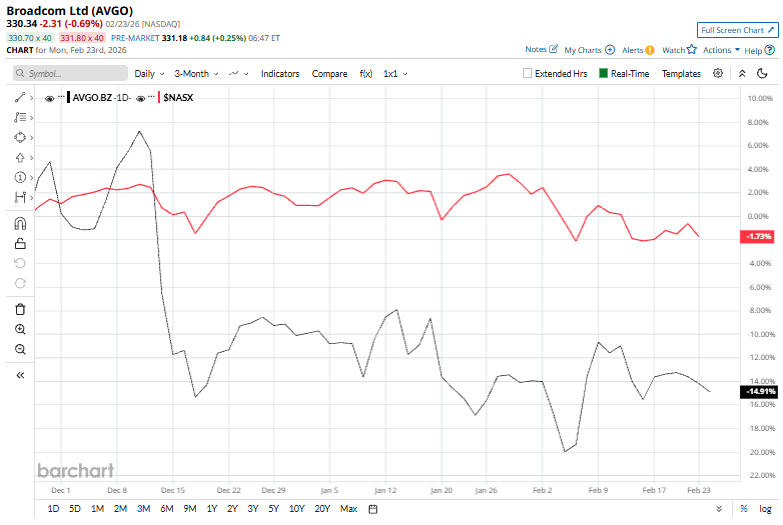 But it’s not all sunshine and rainbows for the stock. AVGO shares have dipped 20.3% from their 52-week high of $414.61 recorded recently on Oct. 30. Over the past three months, shares of AVGO have dwindled 2.9%, lagging behind the Nasdaq Composite’s ($NASX) 1.6% rise during the same period.
