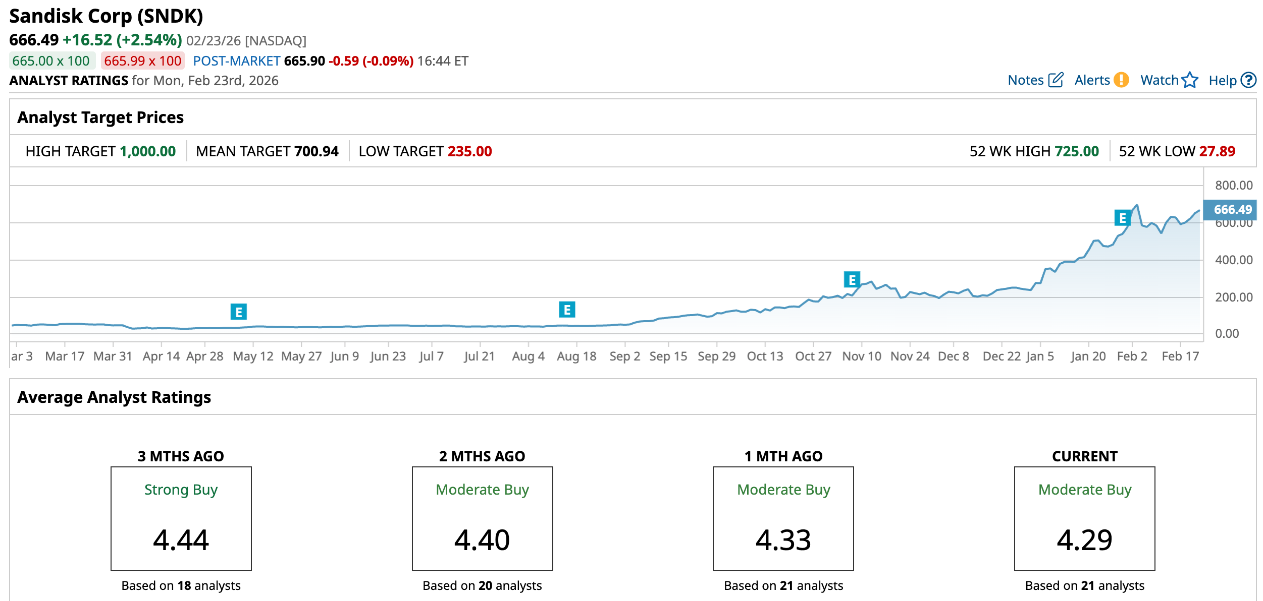 SNDK’s average analyst price target of $700.94 indicates an upside of 5.2%, while Bernstein SocGen’s Street-high target price of $1,000 suggests that the stock could rally as much as 50%.