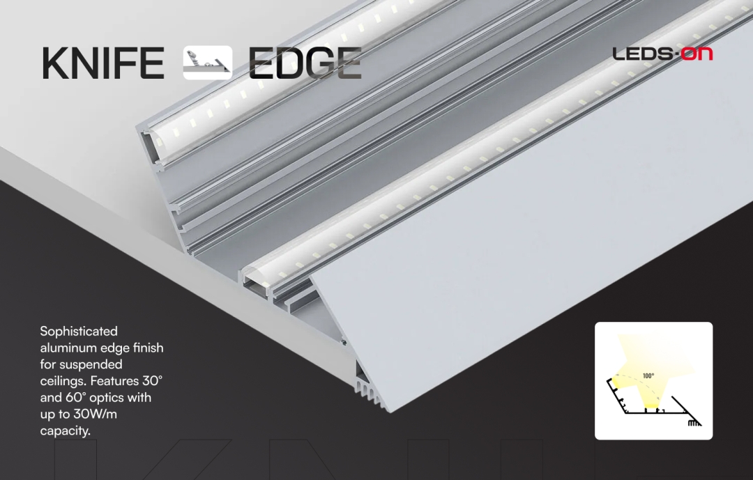 The Knife Edge profile from LEDSON is purpose-built for this application. It offers interchangeable 30-degree and 60-degree optics alongside transparent and matte diffusers, giving designers the flexibility to control light throw distance and diffusion quality within a single system. Despite weighing only 1.1 kg/m, the profile accommodates up to three rows of LEDs with a combined output of 30W/m — enough to serve as primary perimeter lighting, not merely decorative accent.