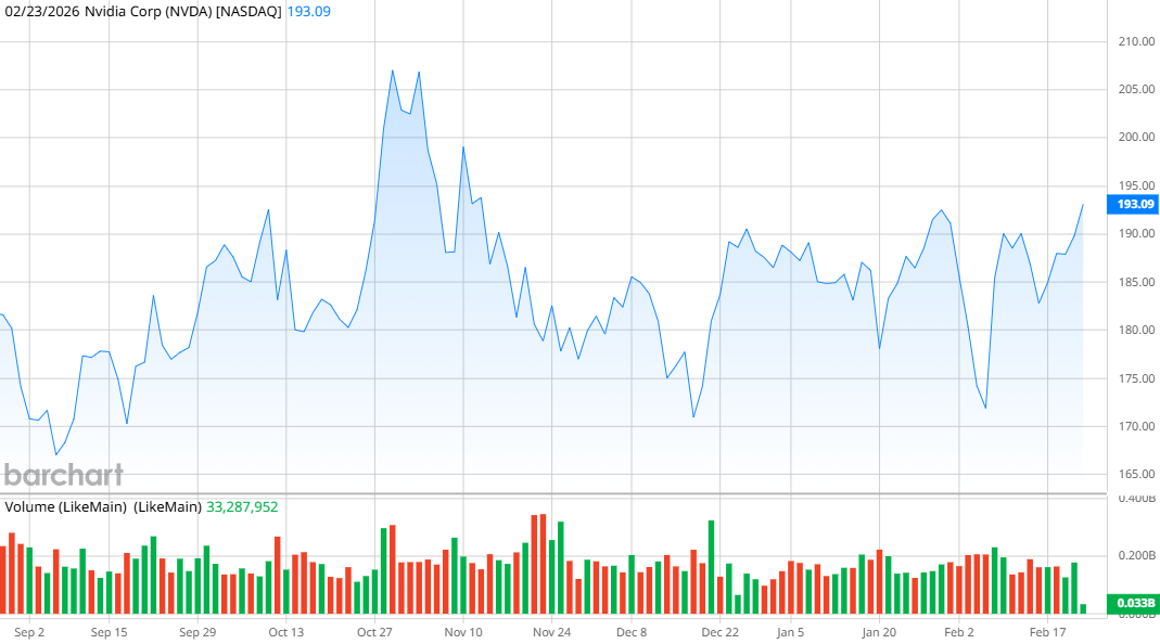Shares are up 44% in the last year but have shown some volatility in recent months as investors have largely pulled back on AI stocks. However, a series of announcements from Nvidia’s major customers that pledge several hundred billion in new AI investments this year has restored investor confidence ahead of Nvidia’s upcoming earnings on Feb. 25, pushing the stock 10% higher over the last three weeks.