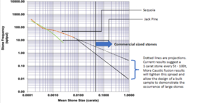 Figure 1 - Size Frequency plot: Diamond size distribution. Note Sequoia is Orange and Jack Pine in Green. The Sequoia samples appear to have two populations of diamonds and clearly have a higher frequency of larger diamonds than the Jack Pine sample. Figure 1 also depicts possible trajectories for the Sequoia diamond distribution. For this small sample of less than 300kg, the spread of trajectories is large. Further caustic fusion samples would narrow down this spread. It is desirable to have several commercial size stones from caustic fusion before predicting grade and size distribution with great accuracy.