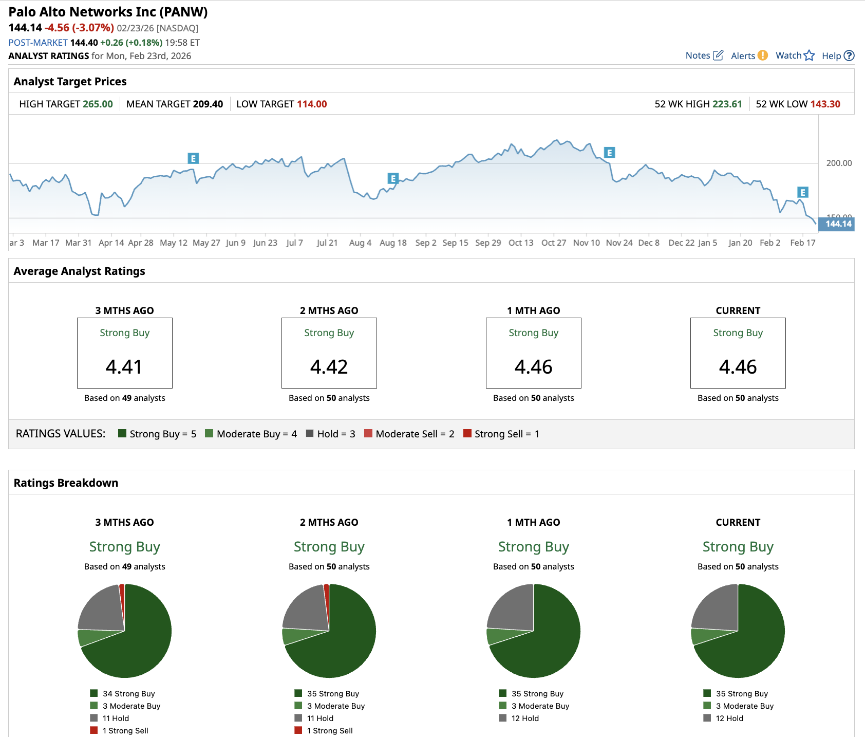 Out of the 50 analysts covering PANW stock, 35 recommend “Strong Buy,” three recommend “Moderate Buy,” 12 recommend “Hold,” and two recommend “Strong Sell.” The average PANW stock price target is $209.40, above the current price of about $144.
