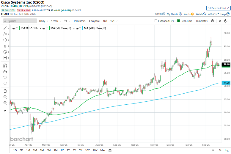 From a technical perspective, CSCO has remained above its 200-day moving average since April 2025 and has moved above its 50-day moving average in late January, indicating a sustained upward bias despite recent volatility.