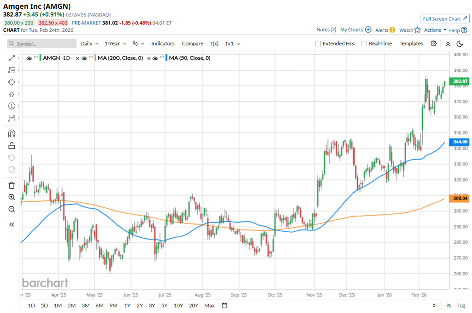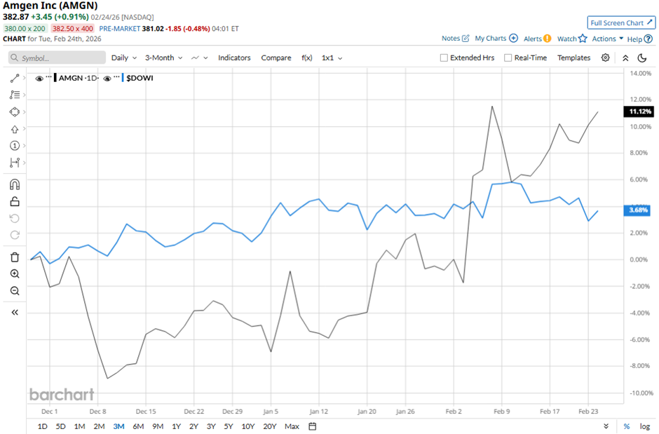 Shares of Amgen have declined marginally from its 52-week high of $385.12. Over the past three months, its shares have increased 14.5%, outperforming the broader Dow Jones Industrials Average's ($DOWI) 5.9% rise during the same period.