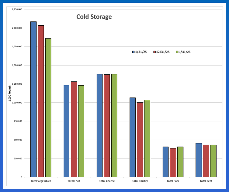 Speaking of government numbers, the USDA/NASS Cold Storage report for January 31, 2026, was released Tuesday afternoon. While the data raises an interesting economic discussion, in the end we have to keep in mind they are still only government numbers from an agency that – how can I put this nicely – isn’t necessarily viewed as releasing accurate data. Particularly these days. But again, that’s a topic for another day.