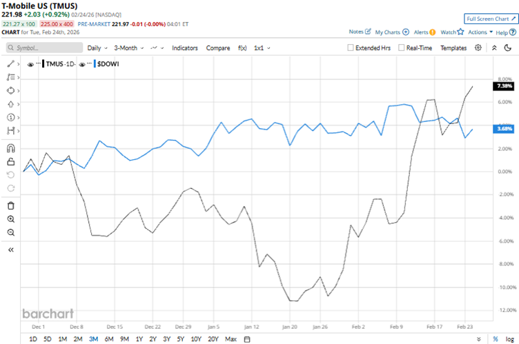 T-Mobile’s stock reached a 52-week low of $181.36 on Jan. 21, but is up 22.4% from that level. The stock has been up 7.1% over the past three months. Contrarily, the broader Dow Jones Industrial Average ($DOWI) is up 5.9% over the same period. Therefore, the stock has outperformed the wider index over this period.