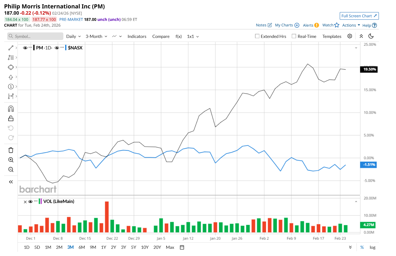 This tobacco giant is currently trading 2.1% below its 52-week high of $190.98, reached on Feb. 12. Shares of PM have soared 23.8% over the past three months, considerably outpacing the Nasdaq Composite’s ($NASX) marginal drop during the same time frame.