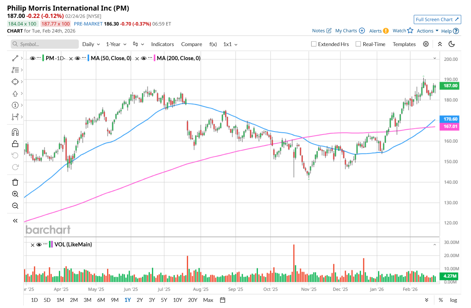 To confirm its bullish trend, PM has been trading above its 200-day moving average since mid-January, and has remained above its 50-day moving average since mid-December.