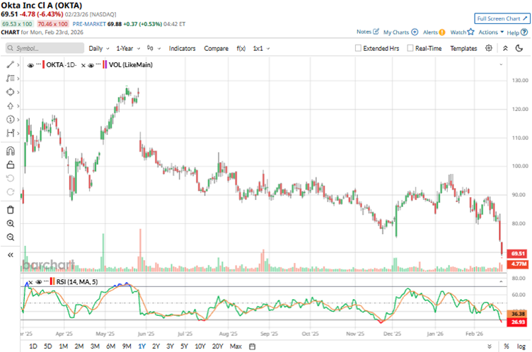 Identity and access management company Okta (OKTA) dropped 6.4% intraday on Feb. 23, after a 9.2% drop on Feb. 20, after artificial intelligence (AI) firm Anthropic released a new security tool for its Claude model. The AI lab stated that the service can analyze software code for security flaws and recommend fixes.