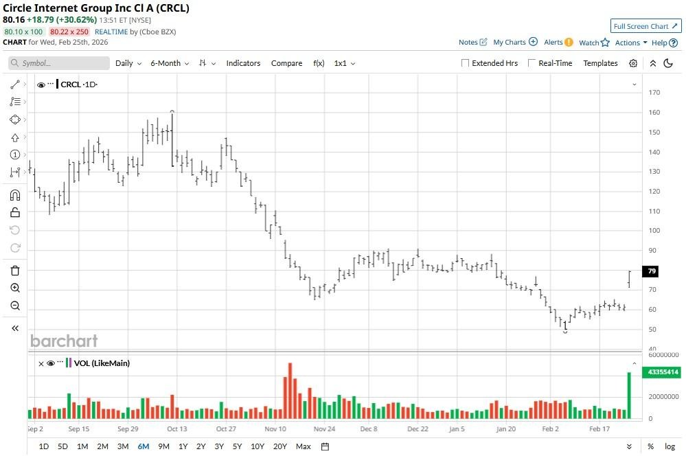 Circle Internet Group (CRCL) shares pushed aggressively to the upside on Wednesday after the crypto company announced a blockbuster Q4, citing improving margins and growing on-platform USDC mix. As investors cheered Circle's blowout release, its share price rallied well past the 50-day moving average (MA) — a technical breakout that often validates a shift in momentum.