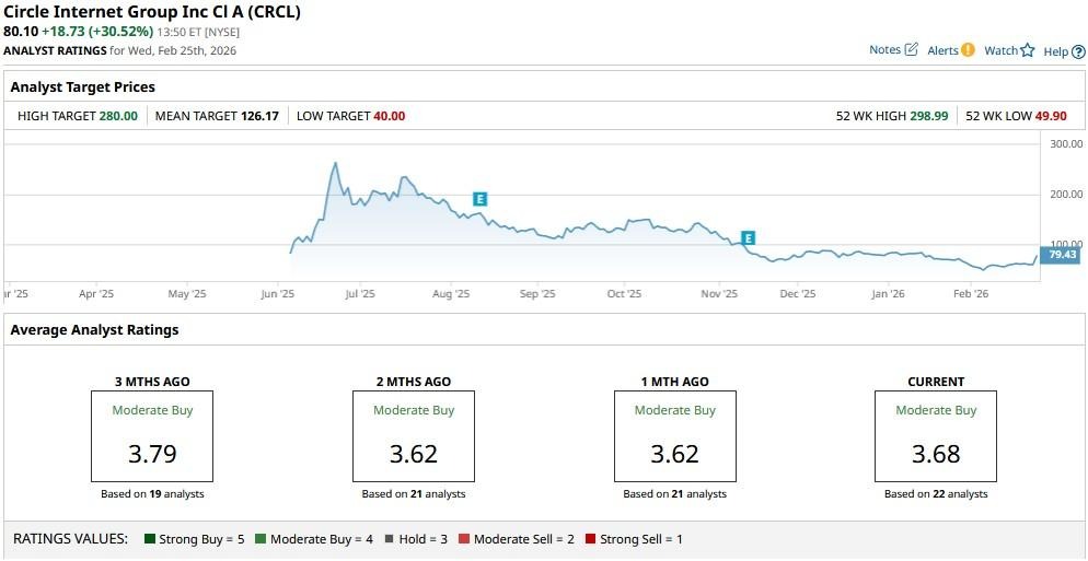 The consensus rating on CRCL shares remains at “Moderate Buy” with the mean target of roughly $126 indicating potential upside of more than 50% from here.
