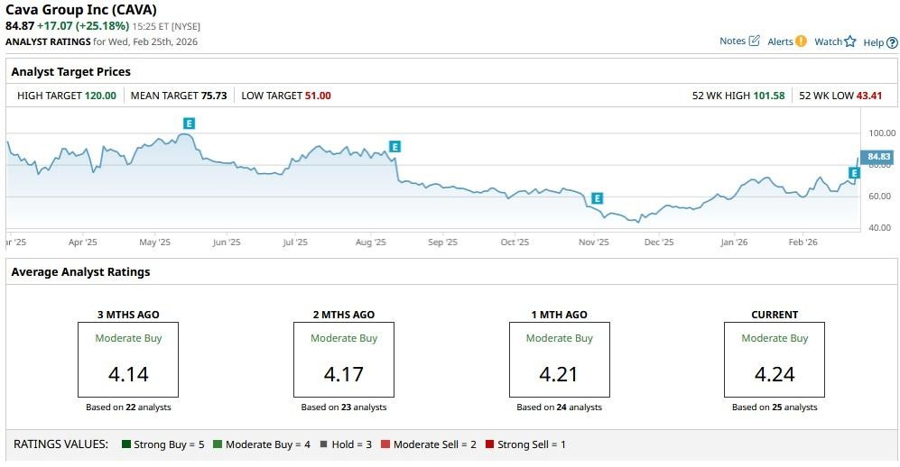 Together with menu innovation and a fast-growing digital footprint, CAVA looks on track to hitting $90 in 2026, it concluded.