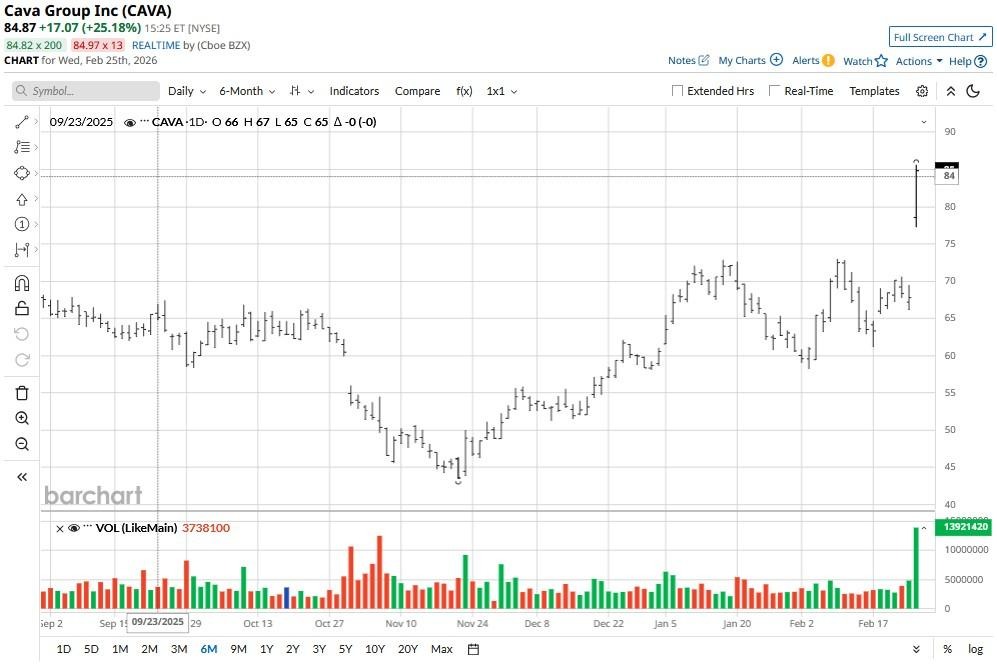 Cava Group (CAVA) jumped about 25% higher on Wednesday after the Mediterranean fast-casual restaurant chain said a strong Q4 helped its full-year revenue surpass $1 billion for the first time. This meteoric run pushed CAVA’s relative strength index (14-day) in the 70s, signaling overbought conditions that often precede a significant correction.