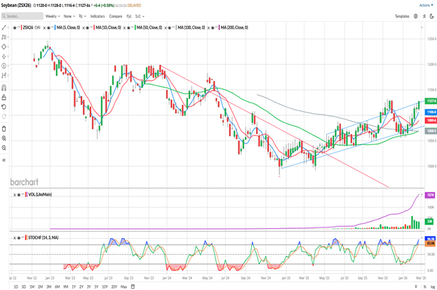 The weekly chart of November Soybeans just above appears to show a market that has been in a choppy, uptrending channel since posting the contract low in December 2024. It certainly hasn’t been a straight move higher, and barring an unforeseen event, I would expect that pattern to continue. You might notice the blue trendlines that I’ve drawn on the chart above. We’re currently seeing the market break out (or attempt to, anyway) above the high trendline. Prices have gone above that trendline, most recently this past November, on more than one occasion over the past year and have always returned to the lower trendline. Today those levels are near 11.25 on the upper end and near 10.75 on the lower end. If you were to draw a line across the highs in June-November, that would be up near 11.60 this week. I don’t typically use those spike highs/lows for trendlines (that’s why it’s not pictured), but if you do, now you know where that upper one could be.