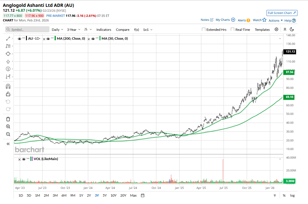 AU has a consensus rating of “Strong Buy” from the seven analysts polled by Barchart, but the stock has run ahead of its mean target price of $114. Even the Street-high target price of $132 is just about 9% higher than current price levels. Such anomalies are not uncommon when a stock goes parabolic, as AU has been for the last few months, as analysts' actions often lag the actual price action.