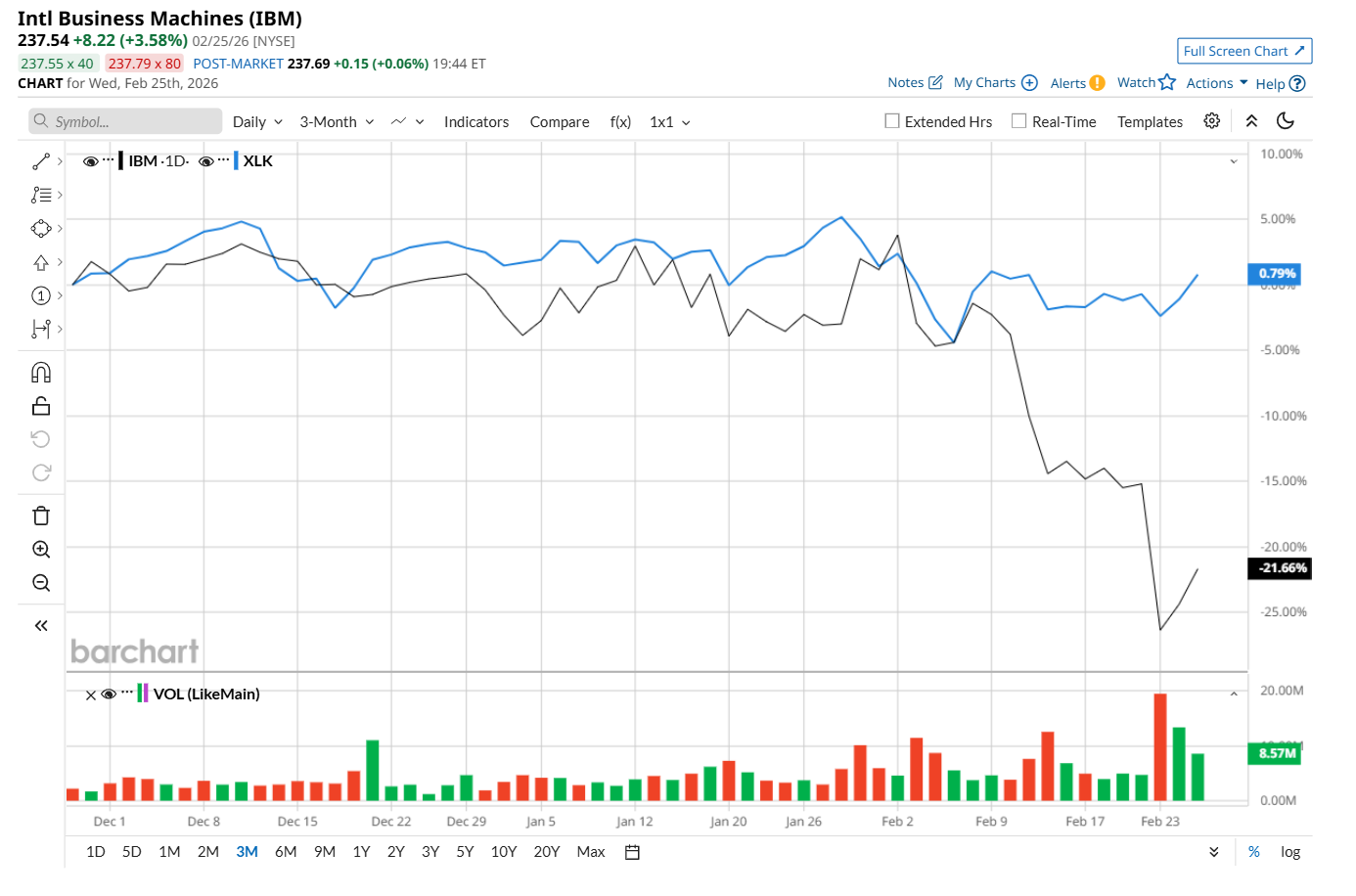 This tech giant has dipped 26.9% from its 52-week high of $324.90, reached on Nov. 12, 2025. Shares of IBM have declined 22% over the past three months, considerably lagging behind the State Street Technology Select Sector SPDR ETF’s (XLK) 2% rise during the same time frame.
