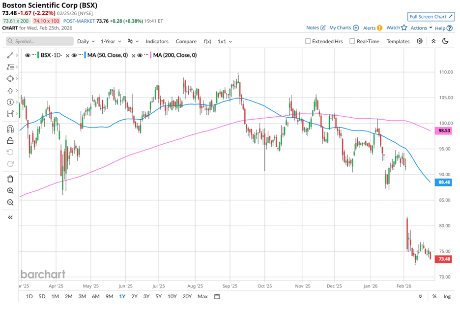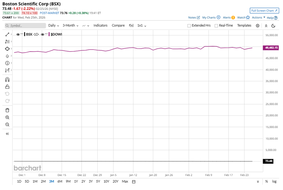 Yet the market has taken a different view in recent months. BSX stock is trading 32.9% below its September 2025 high of $109.50 and has declined 27.5% over the last three months. Over that same stretch, the Dow Jones Industrial Average ($DOWI) gained 5%.